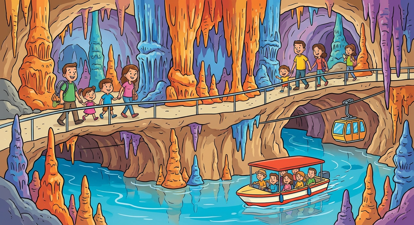 تستقل قارباً صغيراً مسطح القاع ينزلق بصمت فوق نهر جوفي. المياه صافية كالكريستال، تضيئها أنوار ناعمة تجعلها تتوهج باللونين الفيروزي والزمردي. ولأن القارب كهربائي، لا يوجد ضجيج للمحرك، فقط خرير الماء الناعم بينما تنجرف عبر الممرات الضيقة والقاعات الواسعة.